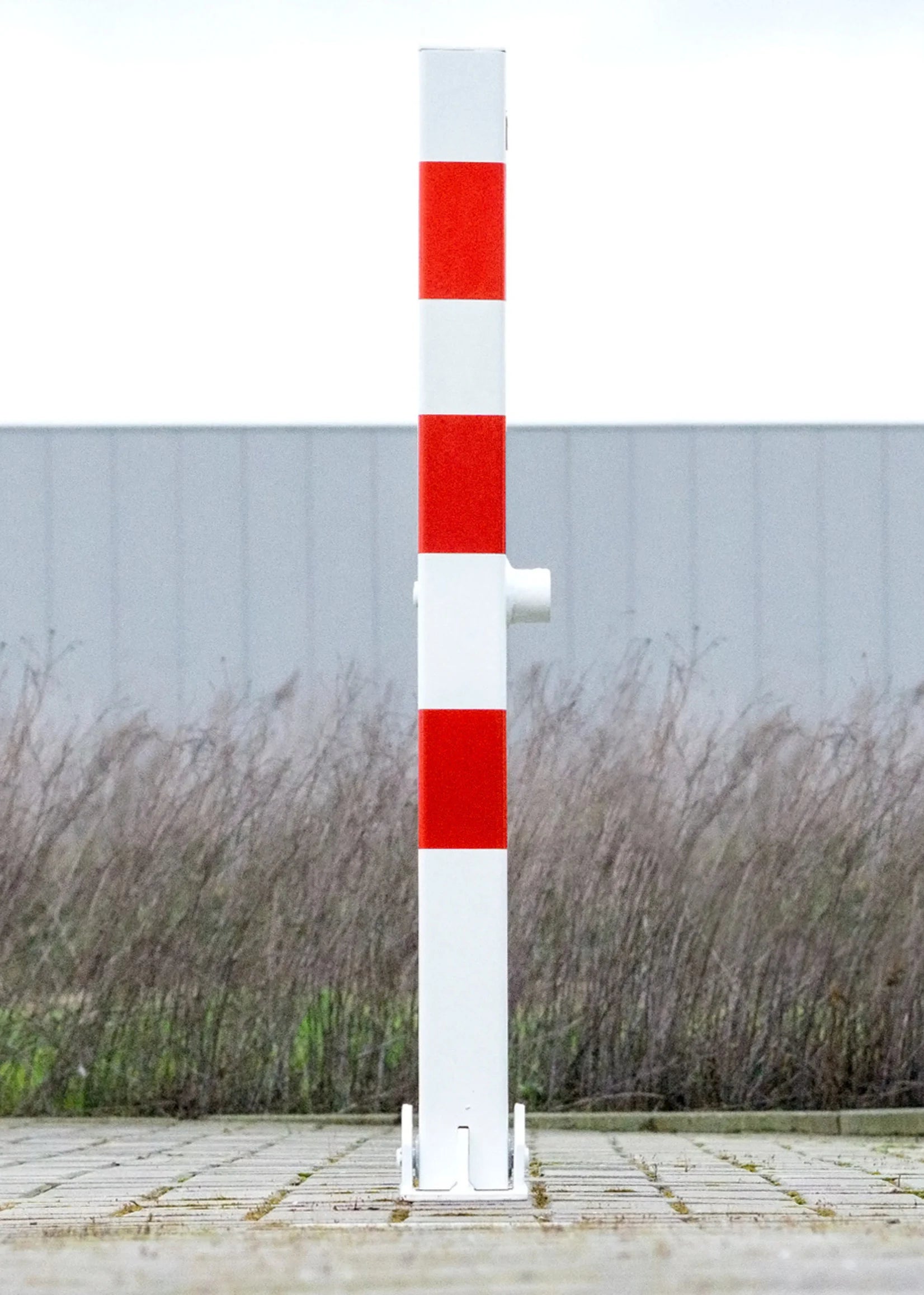 Der robuste Absperrpfosten aus verzinktem Stahl ist rot-weiß pulverbeschichtet und mit reflektierenden Streifen versehen, was für eine hohe Sichtbarkeit sorgt. Dank der klappbaren Konstruktion lässt sich der Pfosten einfach umlegen und bei Bedarf flach auf dem Boden ablegen.