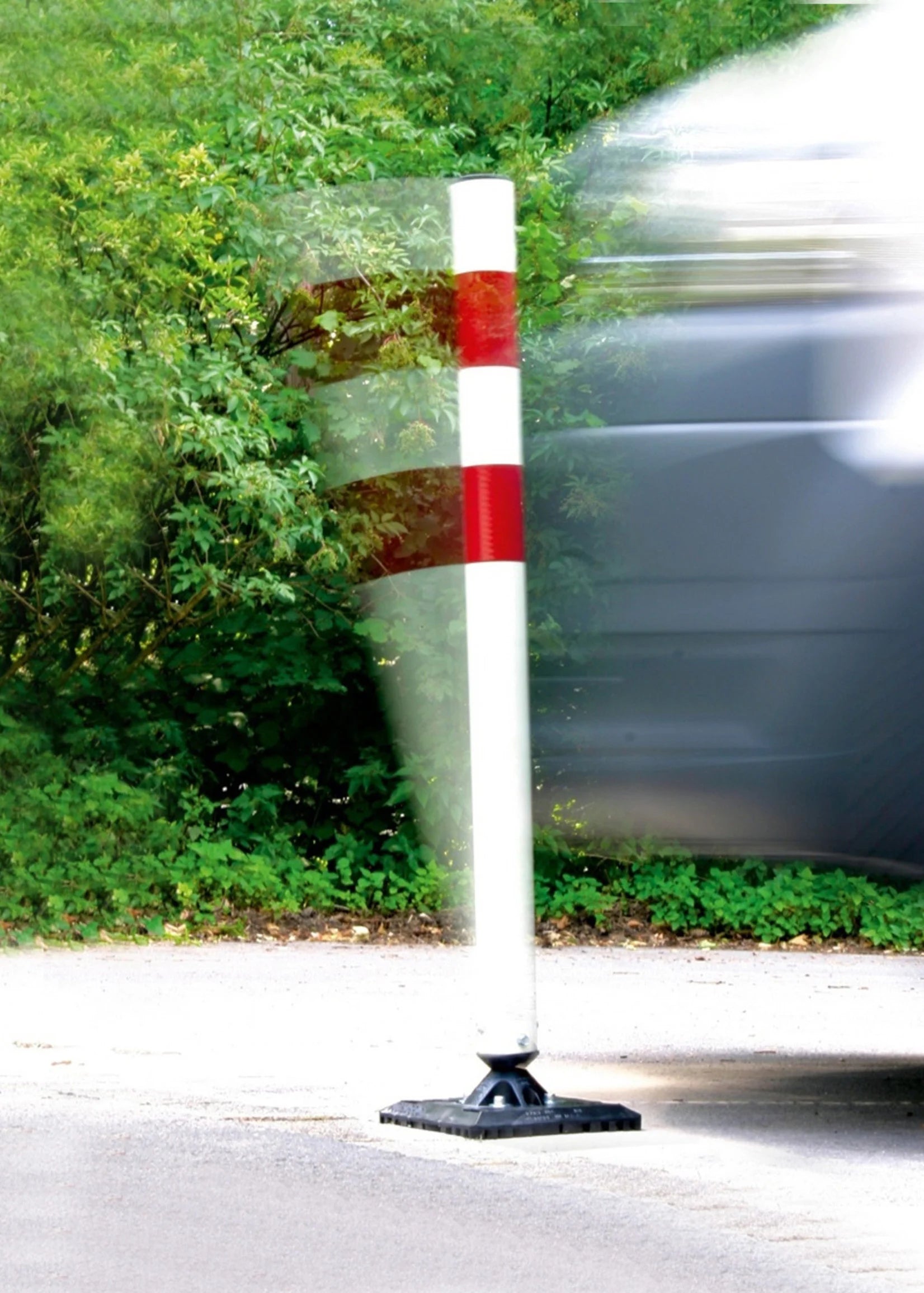 Der KICKBACK-Poller 90 cm ist ein besonders robuster und flexibler Verkehrspoller, der sich nach dem Überfahren oder einem Anstoß automatisch wieder aufrichtet. Dank seines federnden Sockels mit Kunststoffgelenk bleibt der Poller bei Belastung unversehrt und reduziert so Reparaturkosten und Ausfallzeiten.