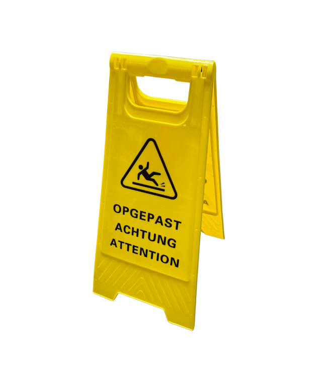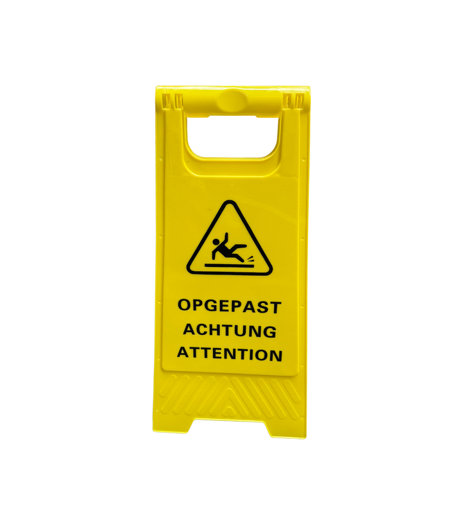 Das klappbare Warnschild „Nasser Boden“ warnt zuverlässig vor Rutschgefahr in Bereichen mit feuchten oder frisch gereinigten Böden.